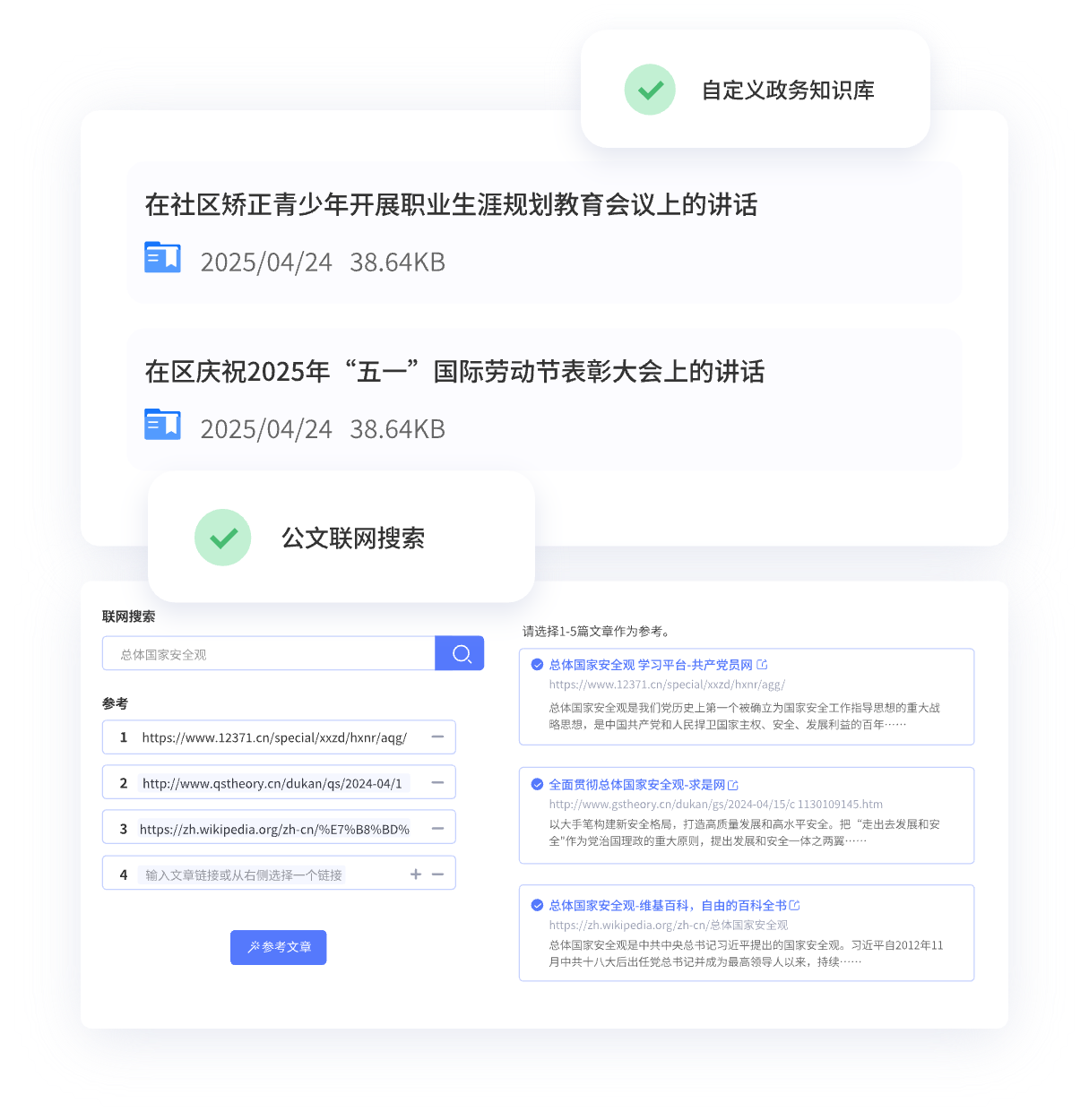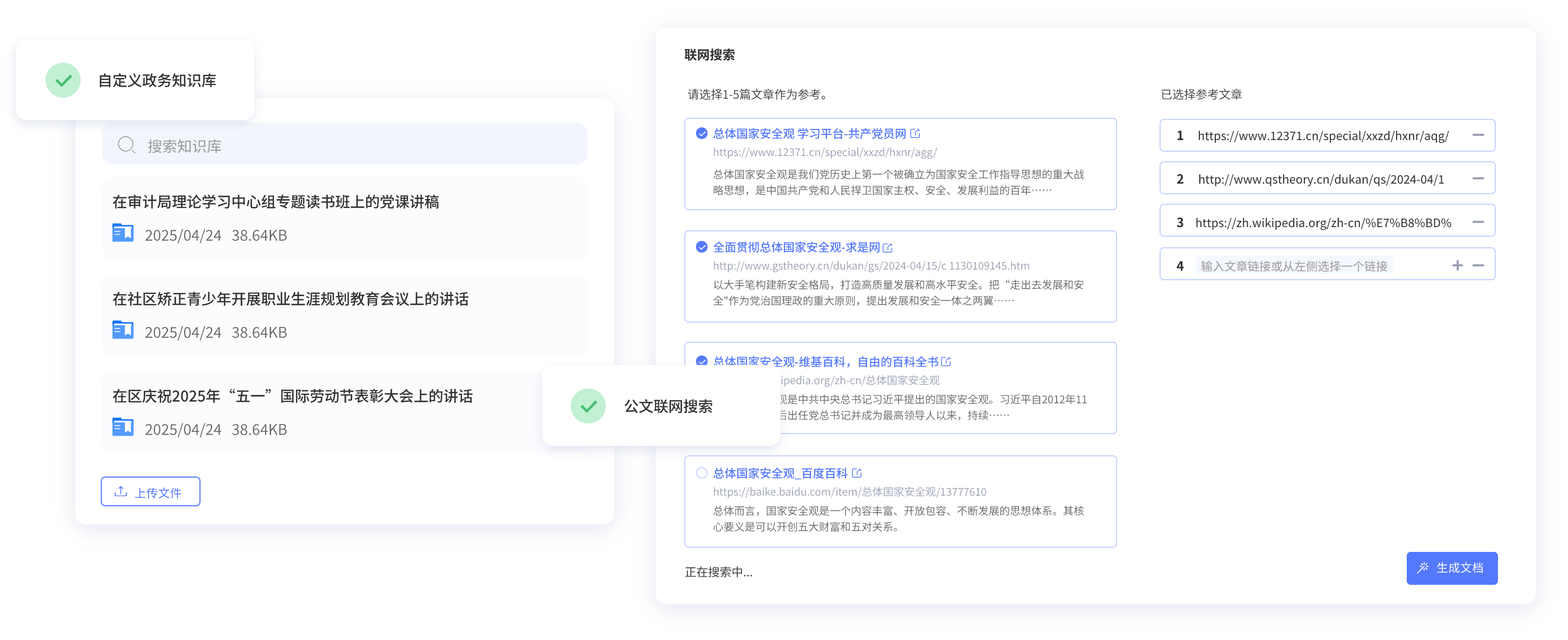 上傳政務(wù)或個人寫作常用材料,用于精準生成符合自己寫作風格的公文